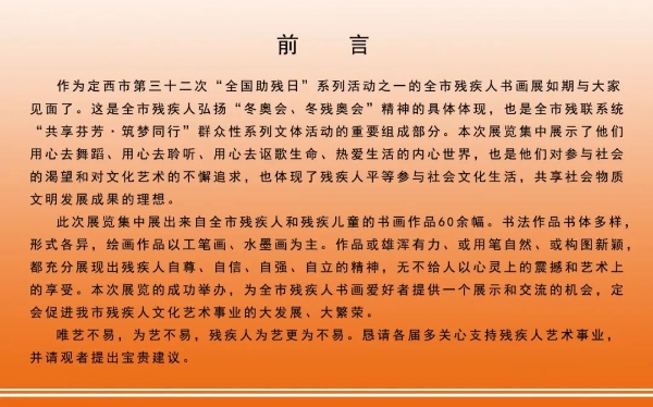 这次残疾人书画展是全市残疾人弘扬“冬奥会、冬残奥会”精神的具体体现,也是全市残联系统“共享芬芳·筑梦同行”群众性文化系列活动的重要组成部分。此次展览集中展出来自全市残疾人和残疾儿童的书画作品60余幅。书法作品书体多样,形式各异,绘画作品以工笔画、水墨画为主。作品或雄浑有力、或用笔自然、或构图新颖,充分展现了我市残疾人自强不息、热爱生活的精神风貌,无不给人以心灵上的震撼和艺术上的享受。
